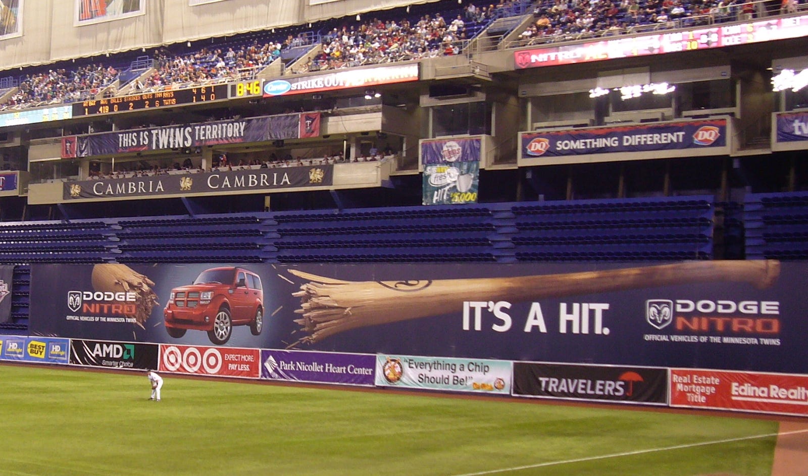 Unlike most multi-use stadiums of its time, the Metrodome was not really kind to baseball in terms of dimensions. It was built and shaped like a very typical non-multi-use football stadium of the era (and kinda similar to the currently active Bank of America Stadium in Charlotte). The Twins still needed a place to play, so the Metrodome underwent more changes to it during a football-to-baseball conversion than most multi-use stadiums. The stands on one of the football sidelines, if kept in their normal place, would make the right field foul pole for baseball roughly 200 feet from home plate. So these seats would be retracted back for the baseball configuration of the Metrodome, but the distance down the right field line was still relatively close to home plate at only 327 feet. So may I introduce you to the “baggie”?